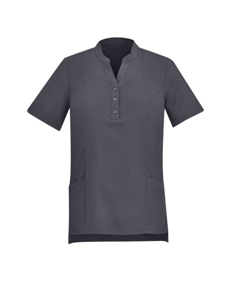 Style features longer hem lengths, short sleeve with cuff detailing, side splits.