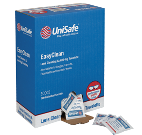 Easy Clean germicidal individually wrapped anti-fog moisture towelettes clean and purify safety equipment including respirators, earmuffs and safety spectacles. Wipes are alcohol free, pleasant smelling and are kind to delicate skin.